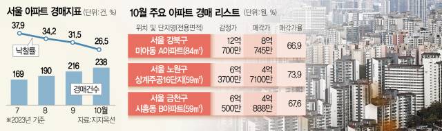 서울 지역 아파트 경매 건수는 238건으로 집계됐다. 이는 2016년 5월(291건) 이후 가장 많은 규모다. 낙찰률은 26.5%로 전월 대비 5.0%포인트 하락하면서 6월(28.3%) 이후 4개월 만에 다시 20%대로 내려 앉았다. 고금리 여파로 새 매물이 늘어난데다 선호도가 낮은 단지의 유찰이 거듭된 탓이다.