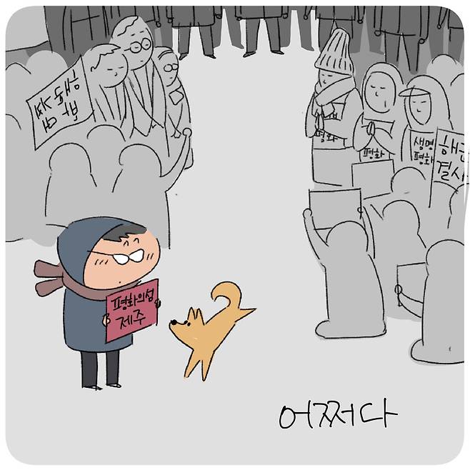 제주에 사는 작가 이연수씨는 2012년 제주 강정 해군기지 반대 집회 현장에서 발랄하게 뛰어다니던 강아지를 만났습니다.