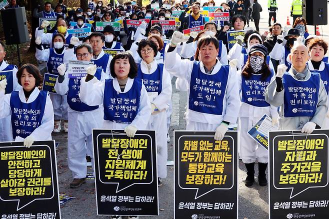 | ▲ 28일 오전 광주 서구 무각사 앞 도로에서 전국장애인부모연대 광주지부 관계자들이 발달장애인에 대한 차별없는 통합 교육 보장 등을 촉구하는 집회를 하고 있다. |