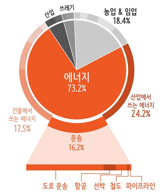 · 탄소가 어디서 많이 배출되는지 산업 영역별로 나눠 분석해 보면, 수송 및 교통 분야는 전체 배출량의 16.2%를 차지해 산업 분야 3위를 기록하고 있습니다.