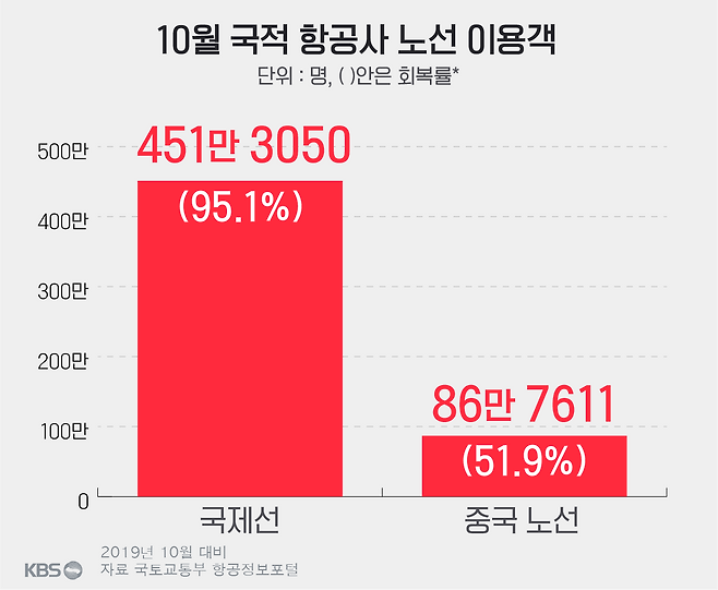 항공사들의 중국 노선 회복도 더딘데요, 지난달 중국을 오간 여객 수는 86만 7,611명으로 코로나 이전 승객의 51.9%에 불과했습니다. 전체 국제선 승객 회복률이 91% 달하는 것에 비하면 한참이나 뛰떨어진 수치입니다.