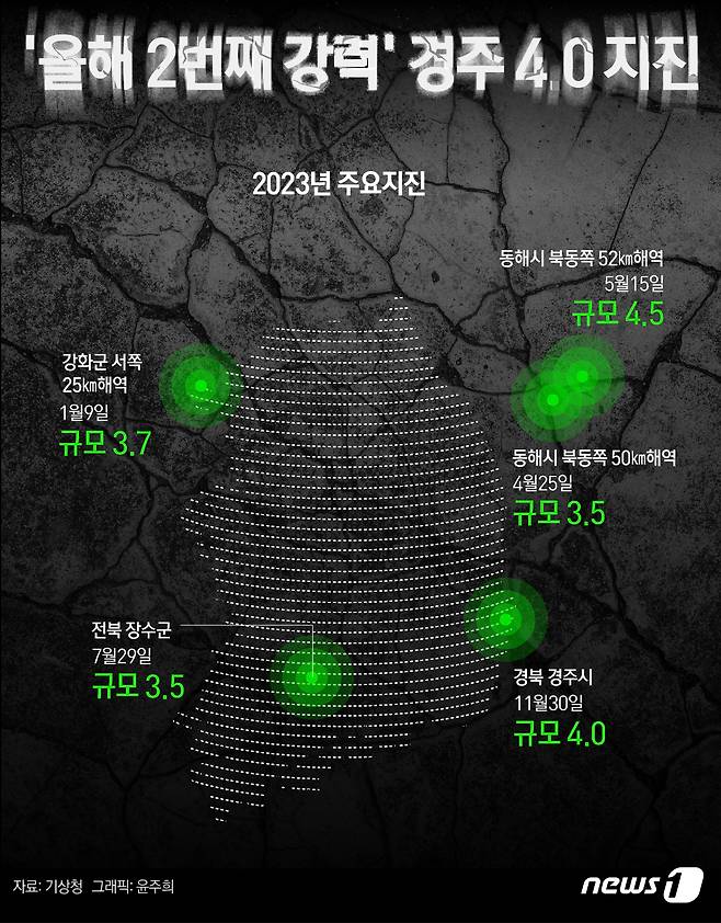 (서울=뉴스1) 윤주희 디자이너 = 30일 기상청에 따르면 이날 오전 4시55분24초쯤 경북 경주 동남동쪽 19㎞ 지역에서 규모 4.0 지진이 발생했다. 발생 위치는 북위 35.79도, 동경 129.42도이며 발생 깊이는 지표면에서 12㎞로 추정된다. 기상청에 따르면 이번 지진은 올해 한반도에서 발생했던 규모 2.0 이상의 99회 지진 중 2번째 규모이며, 내륙에서 발생한 지진 중에는 가장 강력했다. 지진 규모가 가장 컸던 것은 지난 5월15일 강원 동해 북동쪽 52㎞ 해역서 발생했던 규모 4.5 지진이다.