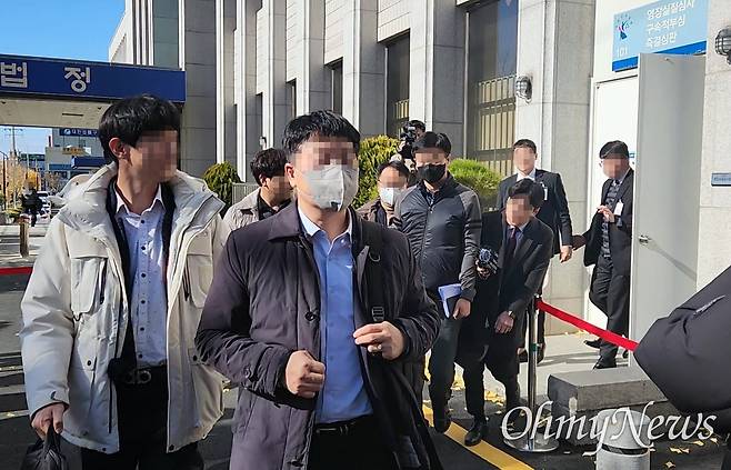| ▲ ‘사건 브로커’ 성아무개(62·구속기소)씨의 청탁을 받아 코인 투자사기 피의자에게 수사 편의를 제공한 혐의로 검찰에 의해 구속영장이 청구된 광주북부경찰서 A 경정과 서울경찰청 금융범죄수사대 B 경감이 30일 광주지방법원에서 구속 전 피의자 심문(영장실질심사)을 마친 뒤 법정을 나서고 있다. |