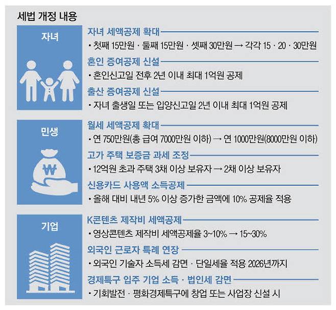 저출생 대책의 일환인 자녀 세액공제 제도도 확대했다. 현재는 첫째 15만원, 둘째 15만원, 셋째 30만원까지 공제가 가능하다. 여야는 이 중 둘째 공제액을 20만원으로 늘리는 데 합의했다. 기본공제 대상에는 손자녀를 추가했다. 현재 연 700만원인 영유아(0∼6세) 의료비 세액공제 한도는 폐지하기로 했다.