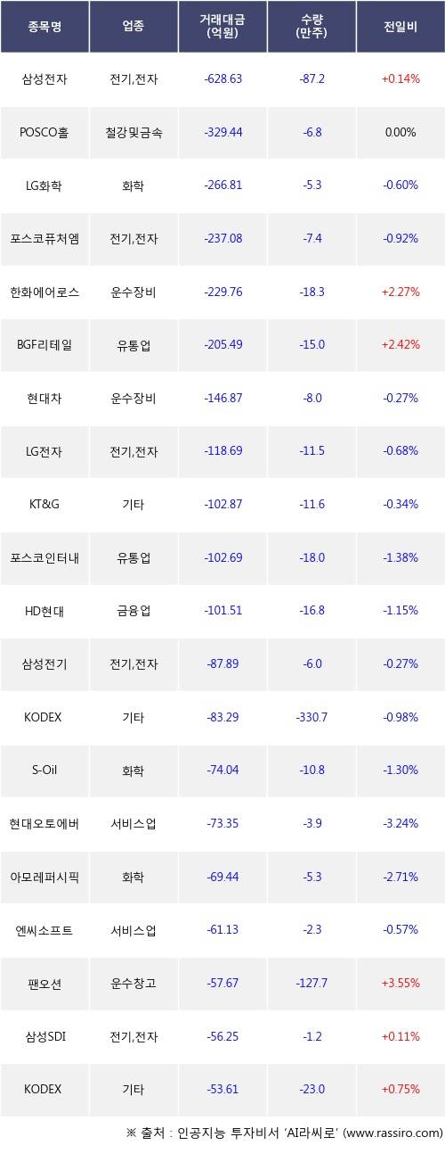 외국인 투자자의 순매도 상위 20개 종목은 삼성전자, POSCO홀딩스, LG화학, 포스코퓨처엠, 한화에어로스페이스, BGF리테일, 현대차, LG전자, KT&G, 포스코인터내셔널등이다.