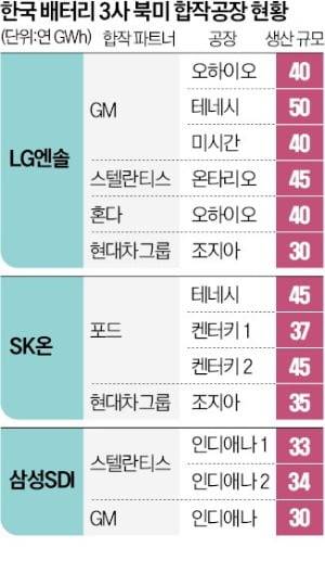 LG에너지솔루션은 북미 지역에 단독 공장 두 곳, 합작공장 여섯 곳을 짓고 있거나 이미 가동 중이다. 확정된 생산 능력만 318GWh에 달한다. 글로벌 배터리 업체를 통틀어 가장 많다. GM과는 북미 합작공장의 절반인 세 곳을 함께 투자했다. 포드·스텔란티스·GM 등과 각각 북미 합작공장을 세 곳씩 짓고 있는 SK온과 삼성SDI도 2025년부터 순차적으로 양산을 시작한다. 증권업계에선 2025년 한국 배터리 3사가 AMPC로 수령할 보조금만 10조원에 달할 것으로 내다봤다.