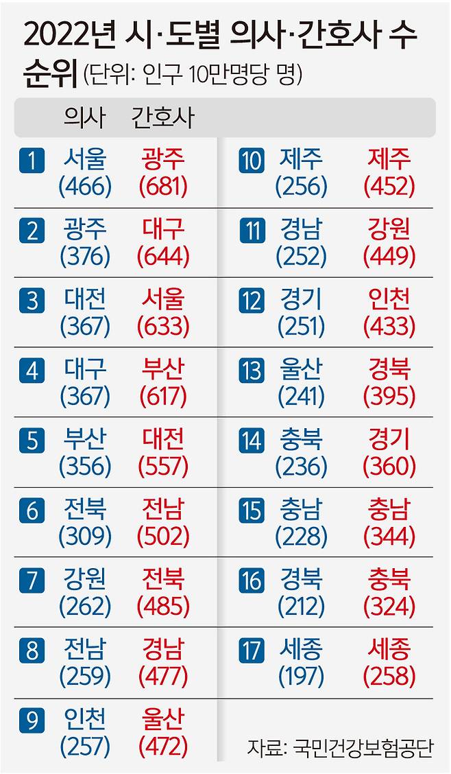 시·도별 의료인력 차이는 컸다. 인구 10만명당 의사 수가 많은 시·도는 서울(466명), 광주(376명)였고 적은 시·도는 세종(197명), 경북(212명)이었다. 시·도 간 차이가 2.4배까지 났다. 간호사 수 역시 지역 간 격차는 있다. 지역별로 광주(681명), 대구(644명) 등은 높은 반면 세종(258명), 충북(324명) 등은 평균보다 낮았다.