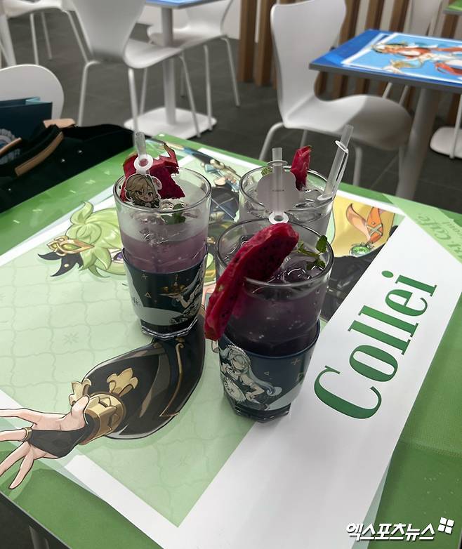 1층 카페에선 '원신' 테마의 여러 식음료를 구매할 수 있다. 일반 카페 메뉴 외에도 이번 '원신 카페'가 수메르, 티바트 대륙의 콘셉트로 론칭한 만큼 해당 대륙에 등장할법한 식음료를 만나볼 수 있었다. 기자가 접했던 '몽환의 보랏빛'은 블루베리, 용과가 들어간 음료였으며, '원신'의 분위기를 한껏 엿볼 수 있었다.
