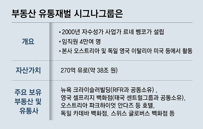 270억 유로(약 38조 원)를 보유한 시그나의 창업자 벵코는 세계 부동산 시장의 유명 인사였다. 2019년 미국 부동산투자기업 RFR과 공동으로 1억5000만 달러에 크라이슬러빌딩(부지는 제외)을 매입해 주목받았다. 영국을 대표하는 셀프리지 백화점, 베를린 간판 카데베 백화점 등 유럽 번화가 백화점도 순식간에 사들였다. 시그나그룹은 이번 파산의 원인과 관련해 “유통부문 투자 수익률이 예상보다 낮은 여파가 컸다”고 밝혔다.