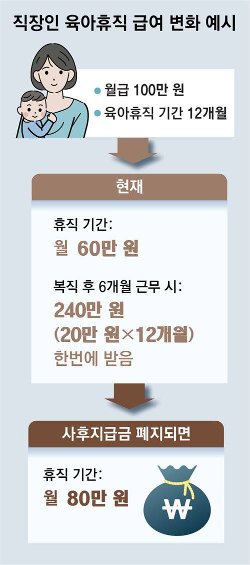 육아휴직 기간에는 육아휴직 급여의 일부만 받고, 나머지는 회사에 복직한 뒤 6개월을 일해야 받을 수 있도록 한 육아휴직 사후지급금 제도가 폐지된다.