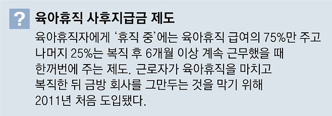 육아휴직 사후지급금 제도란 육아휴직자에게 '휴직 중'에는 육아휴직 급여의 75%만 주고 나머지 25%는 복직 이후 6개월 이상 근무한 것이 확인됐을 때 한꺼번에 주는 제도다.