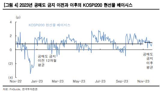 염동찬 한국투자증권 연구원은 "공매도 금지 기간의 현선물 흐름을 좀 더 지켜봐야 하겠지만, 적어도 12월 만기일에 공매도 금지 때문에 주가지수 선물 변동성이 커질 가능성은 제한적"이라고 말했다.