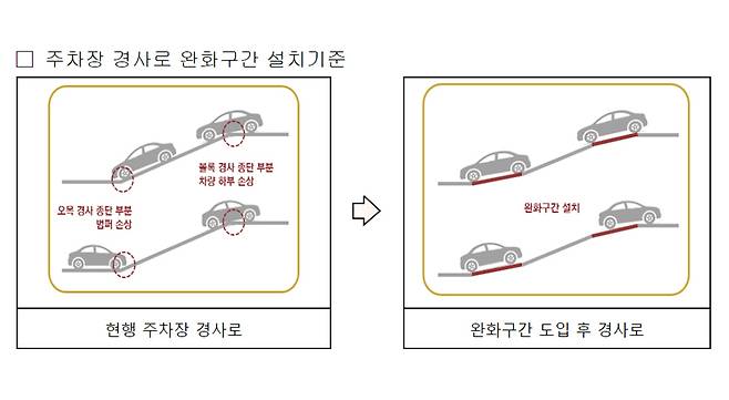 -차체 하부 손상 방지 및 시야 확보 효과 -경보장치 세부설치기준도 마련 국토교통부가 주차장 경사로 완화구간을 도입하는 내용의 '주차장법 시행규칙'을 개정했다고 30일 밝혔다.