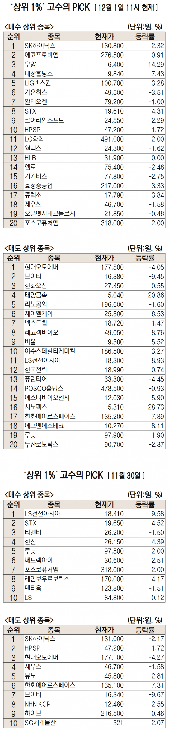 이날 미래에셋엠클럽에 따르면 미래에셋증권 주식 거래 고객 중 최근 1개월 간 투자수익률 상위 1%에 해당하는 '주식 초고수'들이 오전 11시까지 가장 많이 사들인 종목은 SK하이닉스로 집계됐다.