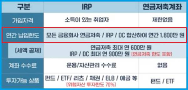 적립IRP(Individual Retirement Pension: 개인형 퇴직연금)는 소득이 있는 국민이라면 누구나 가입이 가능하다. 대상으로는 퇴직일시금을 수령한 퇴직자(퇴직IRP 개설을 필요로 함) 외의 자로 퇴직연금(DB, DC)에 가입된 직장인, 공무원, 교직원, 군인 등 직역연금가입자, 개인사업을 하는 자영업자(소득이 있는 모든 취업자)가 대상이 된다. 적립IRP를 포함한 연금계좌는 전 금융기관 합산 연간 1,800만원한도에서 납입이 가능하다. 실제 가입금액보다 많은 한도를 설정하는 경우 다른 금융기관 가입에 제한이 될 수 있음은 기억해야 한다.