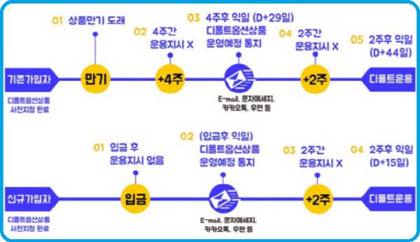 퇴직연금은 노후를 위한 소중한 자산이기에 자산배분을 통해 적절히 위험(Risk)를 감수하면서 보다 높은 수익을 기대할 수 있는 방안을 간구하는 것이 맞다. 하지만 다른 한편으로는 고금리 시기에는 원리금 보장상품에 편안하게 운용함도 추천한다. 가입자의 입장에서는 퇴직연금사업자가 제시하는 다양한 상품들의 특징을 제대로 이해하고 운용할 필요가 있다. 예를들어 원리금보장상품의 경우 디폴트옵션(Default Option)시행으로 처리되는 절차라든지, 만기 시 자동재연장될 때 적용되는 금리나 만기 이전에 중도해지 시 적용되는 금리 등의 확인은 필수인 것이다.