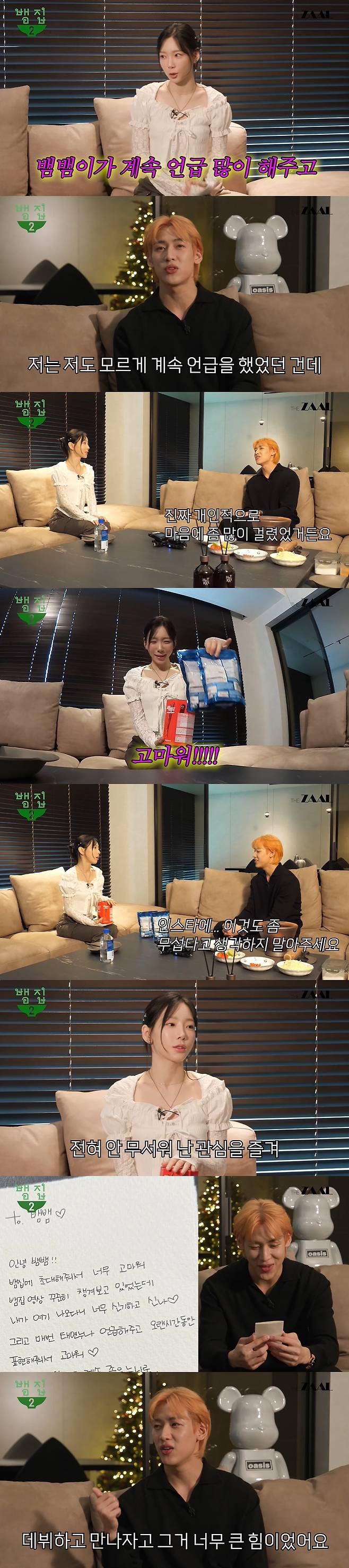 이날 뱀뱀은 태연에게 "그동안 (태연을)너무 언급을 많이 해서 개인적으로 마음에 좀 많이 걸렸다. 저도 모르게 계속 언급 했었던 건데 너무 오바한 것 같아서 마음에 많이 걸렸다"고 했다. 그러자 태연은 "너무 고마웠다. 집에서 볼 때 누가 내 이름을 말해주면 반갑다"고 했다. 그때 뱀뱀은 "좋아한다고 해가지고 혹시나 해서"라며 준비한 것을 건네며 "무섭다고 생각하지 말아달라. SNS에 올린 거 봤다"고 했다. 그러자 태연은 "전혀 안 무섭다. 난 관심을 즐긴다"고 하자, 뱀뱀은 "극 I(내향형)형이라고 들어서 조심스럽더라"며 조심스러워했다.