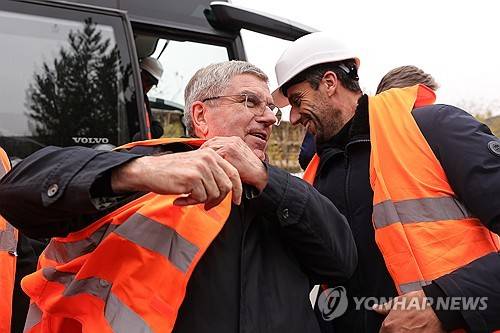 epa11005556 President of IOC Thomas Bach (L) and President of Paris 2024 Olympic Games, Tony Estanguet (R), arrive at the construction site of the Athletes Village for the Paris 2024 Olympic Games during a media tour with members of IOC (International Olympic Committee) in Saint-Denis, north of Paris, France, 01 December 2023. The public company SOLIDEO is responsible for building the various complexes for the Olympic Games, which is scheduled to be ready by the end of 2023. EPA/TERESA SUAREZ