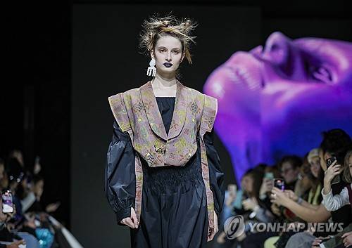 epa11005609 A model presents a creation by Indonesian fashion designer Aldre during a fashion show at the Parking Gallery of Zaryadye park, as part of the BRICS Fashion Summit in Moscow, Russia, 01 December 2023. BRICS Fashion summit runs from 28 November to 02 December 2023. EPA/YURI KOCHETKOV