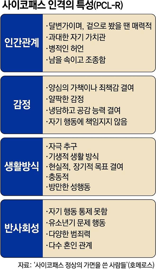 사실 사이코패스는 정식 진단명이 아니다. 정신질환 진단 및 통계편람(DSM-5)에 따르면, 사이코패스는 ‘반사회성 인격장애’에 속한다. 반사회성 인격장애는 △반복적 범법 행위 △충동성 △기만(거짓말, 가명 사용) △분노·공격성 △무책임 △죄책감 결여 등이 특징이다.