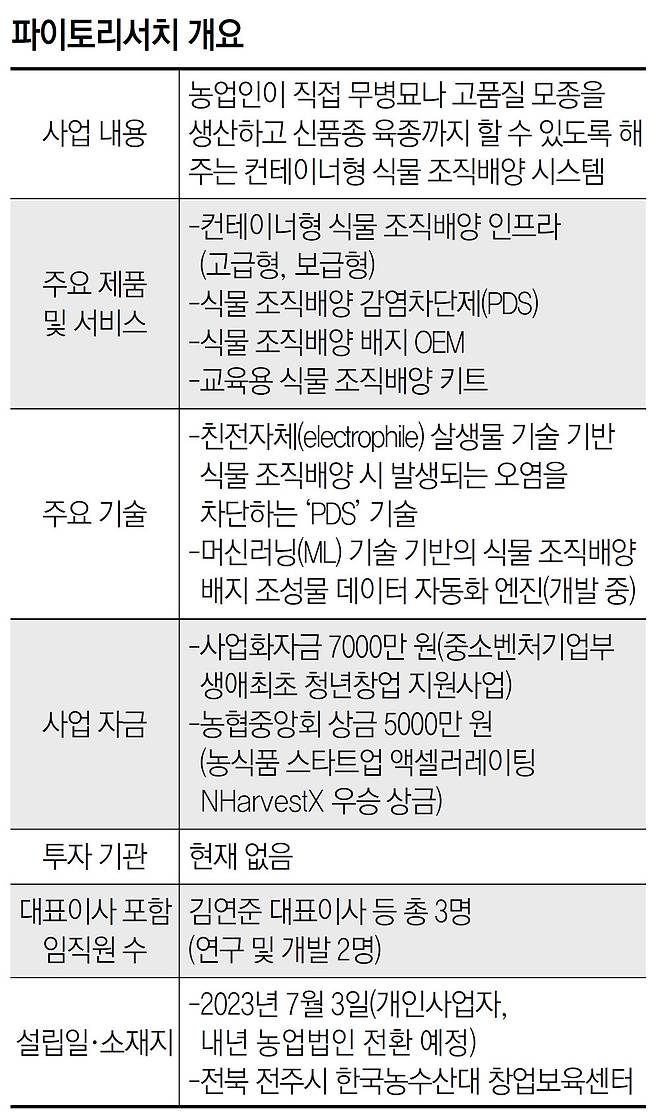 파이토리서치는 내년 1분기에 농업법인으로 전환할 예정이다. 각종 창업경진대회에서 받은 자금 등으로 회사를 운영 중이다. 기술은 다 확보한 상태에서 내년 상반기면 컨테이너 보급이 가능할 것으로 보고 있다. 한국농업기술진흥원과 협업할 예정이다. 김 대표는 “컨테이너 조직배양실이 전국에 보급되면 농업인이 직접 바이러스 없는 모종을 만들 수 있게 되고, 자기만의 품종을 만들 수 있는 시대가 열릴 것”이라며 “향후에는 농가의 컨테이너에서 수집한 데이터를 기반으로 품종 개발을 고도화하고 의약품이나 그린바이오산업의 원료가 되는 식물 소재를 생산하는 차세대 식물공장으로 사업을 확장할 계획”이라고 했다.
