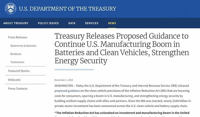 1일(현지시간) 미국 재무부는 인플레이션 감축법(IRA)에 따른 세부지침 발표를 통해 보조금 지급요건을 더 엄격히 구체화했다.