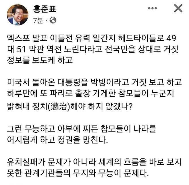 홍 시장은 이날 자신의 페이스북에 올린 글에서 "엑스포 발표 이틀 전 유력 일간지 헤드 타이틀로 '49대 51 막판 역전 노린다'라고 전 국민을 상대로 거짓 정보를 보도케 하고 미국서 돌아온 대통령을 박빙이라고 거짓 보고하고 하루 만에 또 파리로 출장 가게 한 참모들이 누군지 밝혀내 징치(懲治·징계하여 다스림) 해야 하지 안겠나"고 밝혔다.