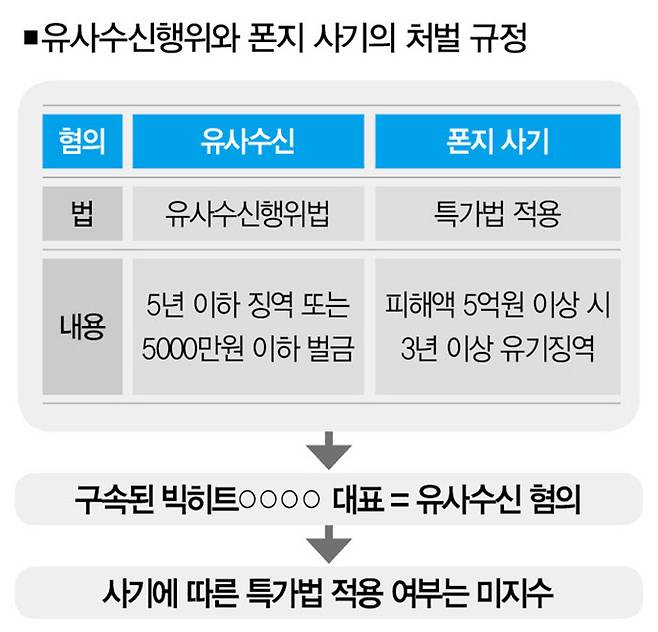 구속된 빅히트○○○○ 대표 역시 혐의는 폰지 사기가 아닌 유사수신(정부의 허락을 받지 않고, 투자금을 모금하는 것)입니다. 폰지 사기는 특정경제범죄 가중처벌 등에 관한 법률(특가법)을, 유사수신은 유사수신행위의 규제에 관한 법률(유사수신행위법)을 적용받습니다. 형량은 사실상 특가법이 더 높습니다. 5억원 이상의 이득만 챙겨도 3년 이상의 유기징역에 처할 수 있습니다.