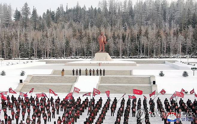 (평양 조선중앙통신=연합뉴스) 북한은 지난 1일 삼지연시 김정일 동상 앞 교양마당에서 전국 청년학생들의 백두산지구 혁명전적지 답사행군대 출발모임이 진행됐다고 조선중앙통신이 2일 보도했다. [조선중앙통신 홈페이지 캡처] 2023.12.2