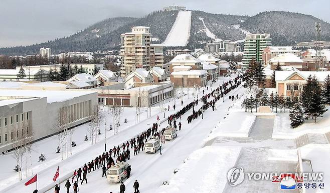 (평양 조선중앙통신=연합뉴스) 북한은 지난 1일 삼지연시 김정일 동상 앞 교양마당에서 전국 청년학생들의 백두산지구 혁명전적지 답사행군대 출발모임을 열고 답사행군대원들은 청봉숙영지, 건창숙영지, 리명수혁명사적지로 행군길을 이어나갔다고 조선중앙통신이 2일 보도했다. [조선중앙통신 홈페이지 캡처] 2023.12.2