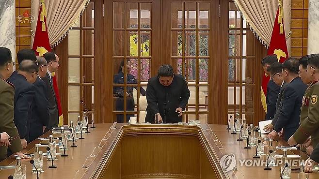 (서울=연합뉴스) 북한 노동당 중앙위원회 정치국은 1일 김정은 국무위원장이 참석한 가운데 회의를 열어 이달 하순 당중앙위원회 제8기 제9차 전원회의를 소집할 것을 결정했다고 조선중앙TV가 2일 보도했다. [조선중앙TV 화면] 2023.12.2