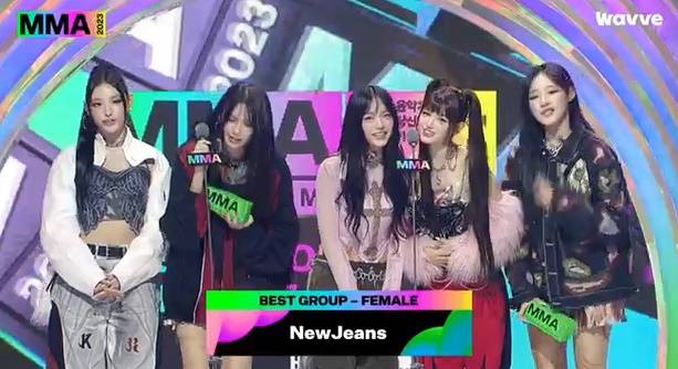 이날 뉴진스는 톱10 수상에 이어 베스트 그룹 여자 부문 수상 팀으로 호명돼 무대에 올랐다.