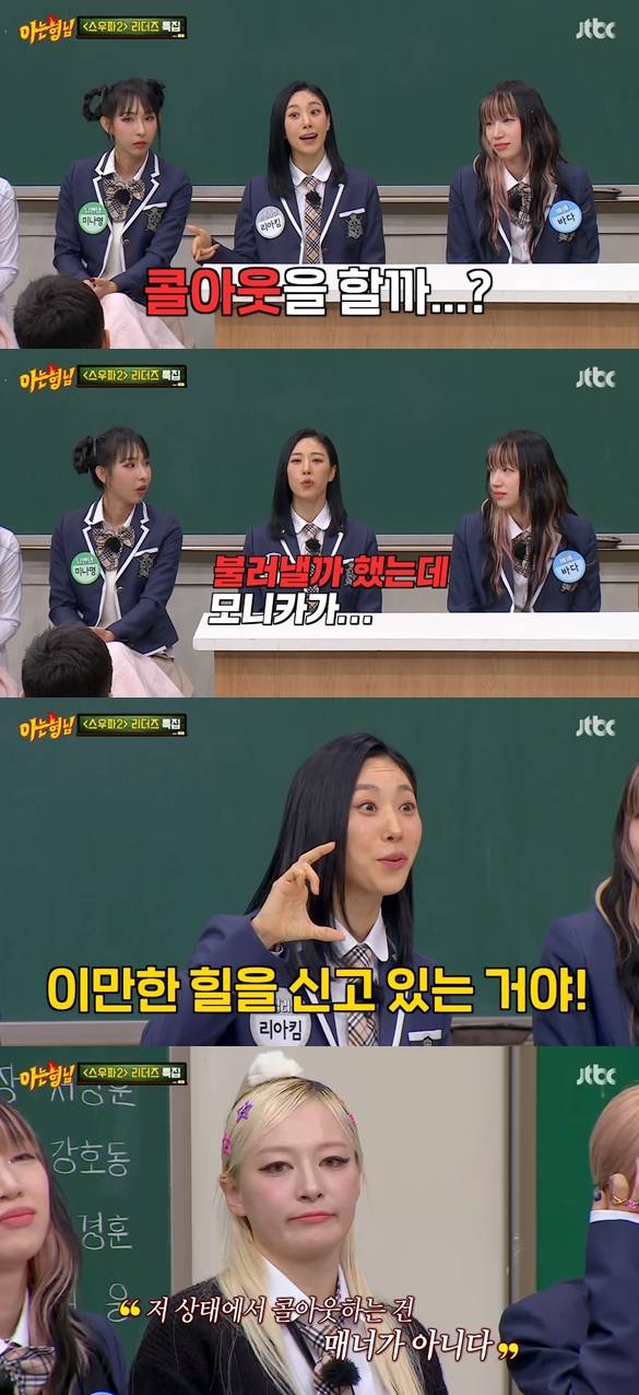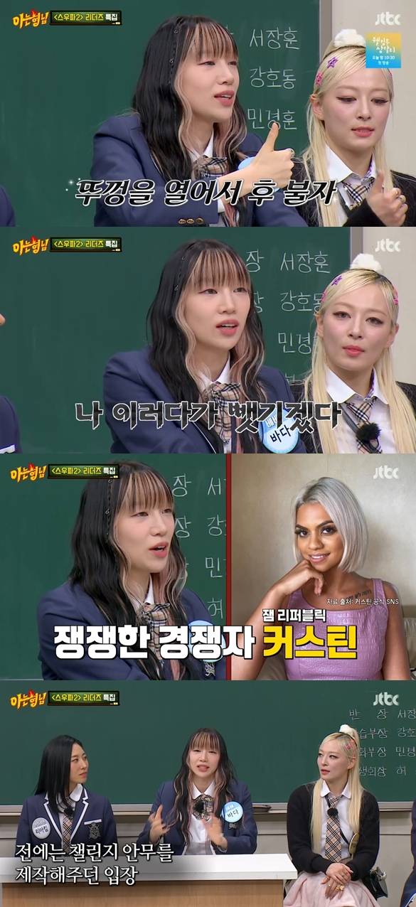 2일 방송된 JTBC '아는형님'에서는 '스우파2' 리더즈 특집이 진행됐다. 해당 방송에는 울플러 리더 할로, 원밀리언 리더 리아킴, 딥앤댑 리더 미나명, 마네퀸 리더 펑키와이, 레이디바운스 리더 놉, 베베 리더 바다가 출연했다.
