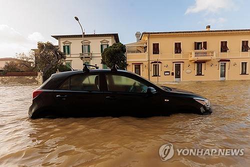 epa11007750 A general view on flooded streets after storms with gusts of wind at 112 km/h hit the city with the sea water entering the streets causing flooding, in Marina di Pisa, Italy, 02 December 2023. The Fire Brigade and the Civil Protection are working on the site helping and rescuing the citizens. EPA/ENRICO MATTIA DEL PUNTA