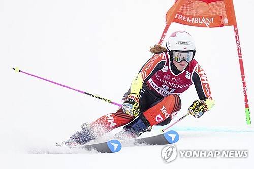 Britt Richardson of Canada speeds down the course as she races in the women's World Cup giant slalom in Mont Tremblant, Que., Saturday, Dec. 2, 2023. (Sean Kilpatrick /The Canadian Press via AP) MANDATORY CREDIT