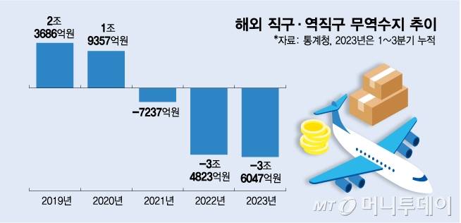 중국 쇼핑앱의 거침없는 진격으로 해외 직접구매(직구)·해외 직접판매(역직구) 무역수지는 악화일로다. 2020년까지는 역직구로 불리는 해외 직접판매가 직접구매를 상회하면서 해외 직구·역직구 무역수지는 흑자를 유지했다. 하지만 2021년 7237억원 적자를 기록한 이후 2022년에는 3조4823억원으로 적자폭이 확대됐으며 올해는 3분기까지 3조6047억원의 적자가 발생했다.