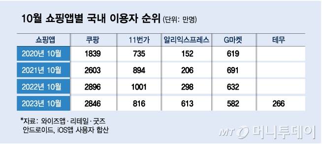 알리익스프레스와 또다른 중국 쇼핑앱 테무의 이용자 수(266만명)을 합치면 879만명으로 11번가를 제치고 2위를 차지할 정도로 중국 쇼핑앱은 거침없이 직격하고 있다. 특히 테무는 8월 집계를 시작한 이후 두 달 만에 이용자수가 다섯 배나 급증했다.