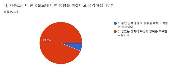 두 번째 질문은 '자승스님이 한국불교에 어떤 영향을 끼쳤나?'였다. 이 질문에 대해서도 '종단 안정과 불교 중흥을 위해 노력한 큰 스님'(6.2%)이라는 답변보다 '끝없는 정치적 욕망과 명예를 추구한 사람이다(93.8%)'라는 응답이 절대적으로 많았다.