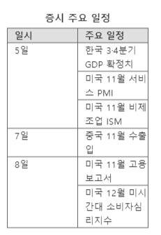문남중 대신증권 연구원은 "이번주는 오는 8일 미국의 11월 고용지표 내 비농업부문 고용자 수 예상치가 20만명으로 전월치 15만명을 상회할 것으로 예상한다"며 "둔화 조짐을 보이던 고용시장이 다시 개선되는 결과로 해석되는데 이 점이 내년 연준의 첫 금리인하 시점이 늦춰지는데 영향을 줄 것으로 점쳐진다"고 말했다.