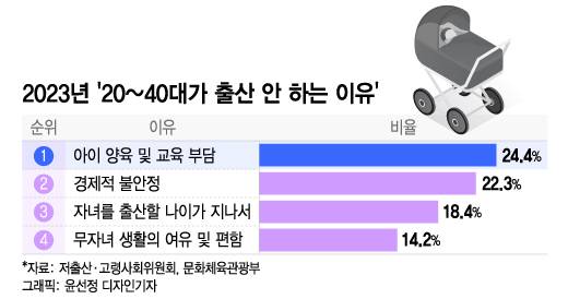 저출산으로 대한민국의 인구 절벽 문제가 가속하는 가운데, '반드시 아기를 낳겠다'는 계획을 세운 20~40대는 5명 중 1명에 불과한 것으로 나타났다. 특히 이들은 출산을 하지 않는 이유로 '양육 및 교육 부담'을 가장 많이 꼽았다.