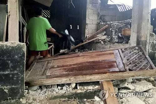 In this handout photo released by the Local Government Unit of Hinatuan, a villager walks beside a damaged house after an earthquake struck Hinatuan town, Surigao del Sur province, southern Philippines on Sunday Dec. 3, 2023. A powerful earthquake struck Saturday off the southern Philippine coast, prompting many villagers to flee their homes in panic around midnight after Philippine authorities issued a tsunami warning. (LGU Hinatuan via AP) AP PROVIDES ACCESS TO THIS PUBLICLY DISTRIBUTED HANDOUT PHOTO PROVIDED BY THE LOCAL GOVERNMENT UNIT OF HINATUAN ; MANDATORY CREDIT.