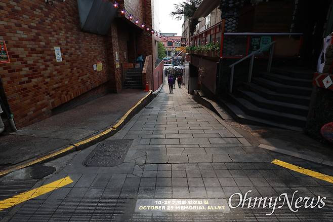 | ▲ '기억과 안전의 길' 10.29이태원참사 1주기를 앞둔 10월 26일 오전 서울 용산구 이태원역 1번출구 부근 참사 현장에서 ’10.29기억과 안전의 길' 조성 기자회견이 권은비 10.29 기억과 안전의 길 미술가와 유가족 등이 참석한 가운데 열렸다. 권은비 작가가 취지와 작품을 설명하고 있다. 골목길 입구 바닥에 '우리에겐 아직 기억해야할 이름들이 있습니다'가 새겨져 있다. |