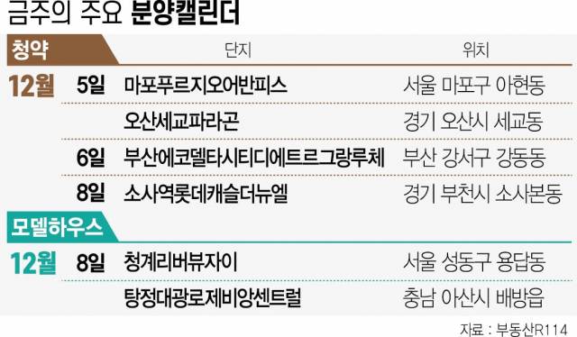 경기·인천에서는 오산세교파라곤(5일), e편한세상제물포역파크메종(5일), 왕길역로열파크씨티푸르지오(5일), 소사역롯데캐슬더뉴엘(8일), 제일풍경채 검단IV(8일)이 분양한다.