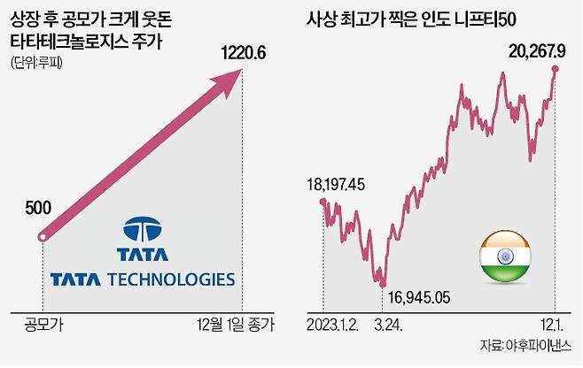 인도 최대 기업 타타그룹 계열사인 타타테크놀로지스 주가가 상장 직후 공모가를 크게 웃돌았다. 연일 사상 최고치를 경신 중인 인도 증시의 활력이 반영됐다는 평가가 나온다.