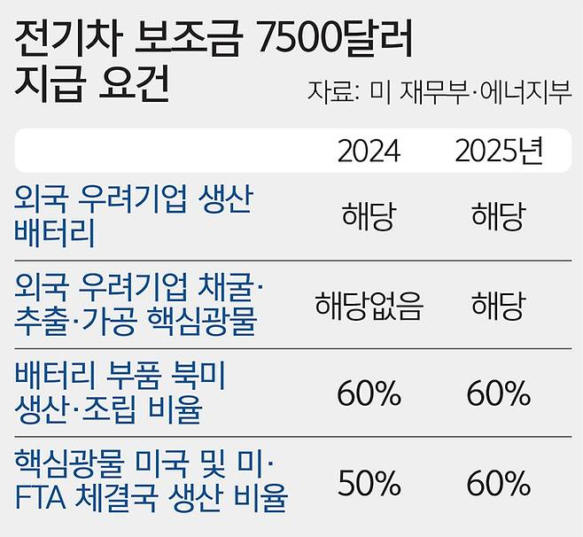 미 정부는 배터리 부품과 핵심광물 원산지 요건을 충족하고 북미에서 최종 조립된 전기차를 대상으로 최대 7500달러(약 975만원)의 세액공제 혜택을 제공하는데 해당 부품을 제공하는 외국 우려기업을 구체화한 것이다.