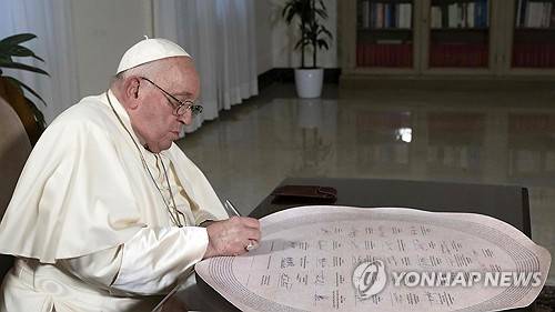 epa11008751 A handout picture provided by the Vatican Media shows Pope Francis signing the 'Confluence of Conscience', that was expected to be signed in Dubai at the inauguration of the 'Faith Pavilion' as part of COP28, together with the president of the United Arab Emirates and the Grand Imam of Al-Azhar, Vatican City, 03 December 2023. Pope Francis was unable to travel to Dubai due to the flu with inflammation of the lungs which has affected him in recent days. EPA/VATICAN MEDIA HANDOUT HANDOUT EDITORIAL USE ONLY/NO SALES HANDOUT EDITORIAL USE ONLY/NO SALES