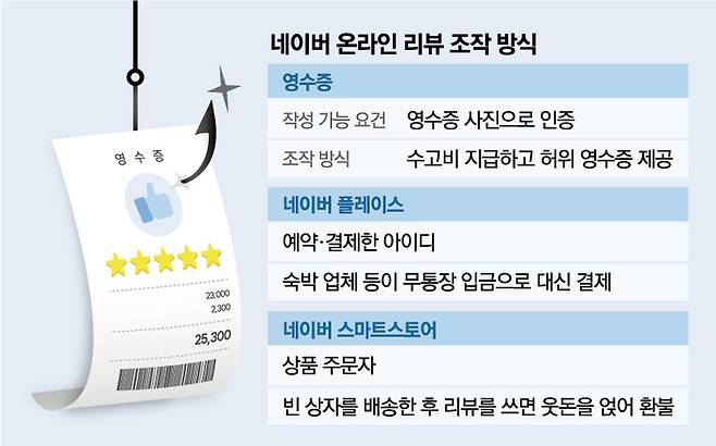 3일 네이버에 따르면 영수증 리뷰는 식당·카페·미용실 등 매장을 실제 방문한 소비자만 후기를 남길 수 있게 설계됐다. 영수증 사진 인증이 필수다. 앞서 네이버는 이용 후기 신뢰성을 높이고 소비자에게 양질의 정보를 제공하겠다는 취지로 2019년 이같은 방식을 도입했다. 하지만 A한의원 사례처럼 실제 방문한 적이 없는 가짜 고객에게 영수증을 전달하고 허위 리뷰를 작성토록 하는 일이 비일비재하다. 네이버 관계자는 “허위 영수증을 발급해 리뷰 조작에 활용한 뒤 결제를 취소하면 취소 여부까지 확인할 수 있는 방법은 없다”고 말했다.