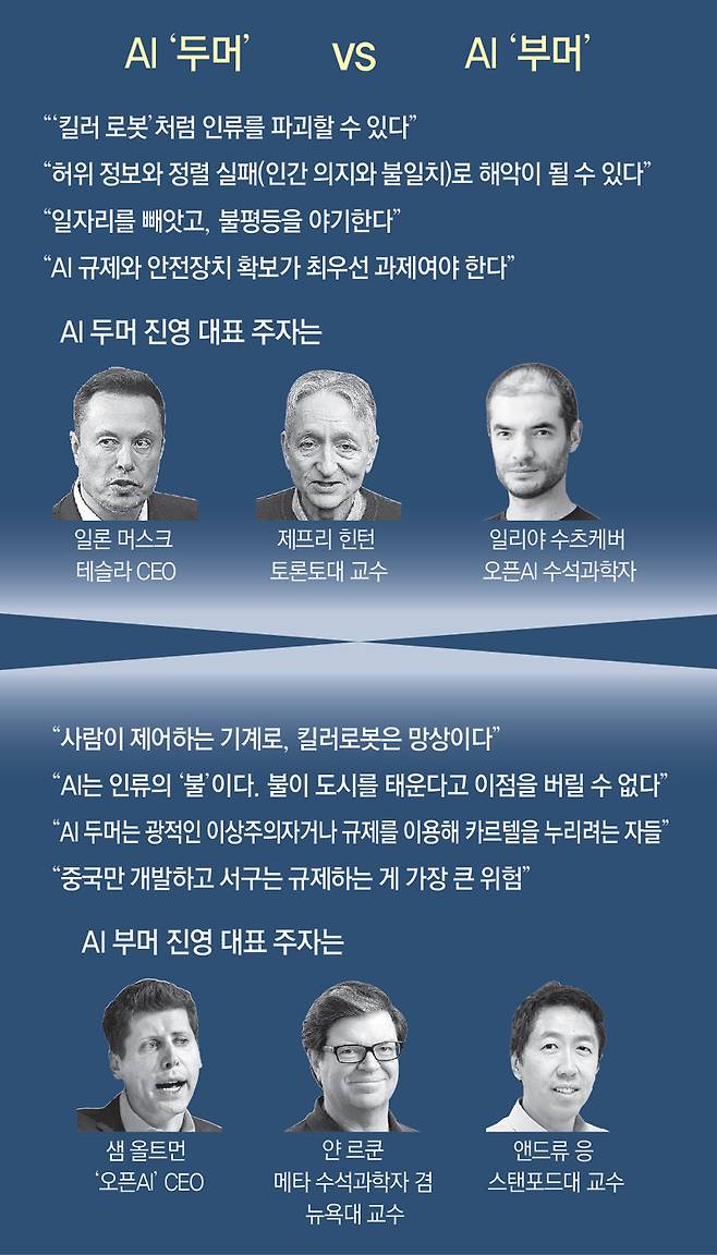 AI 부머들은 두머 진영에 대해 “킬러 로봇이란 망상에 빠진 비과학적 컬트 집단”이라고 비난한다. ‘AI 4대 천황’으로 꼽히는 메타 수석과학자 얀 르쾽 뉴욕대 교수와 앤드루 응 스탠퍼드대 교수는 “AI에 대한 공포가 과장됐다”며 기술에 대한 믿음을 설파하고 있다.