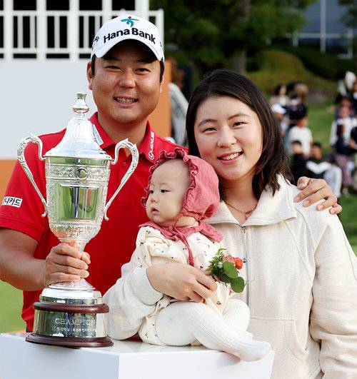 | 함정우 “가족은 나의 힘” 함정우(왼쪽)와 아내 강예린, 딸 소율 양. 함정우와 강예린은 한국프로골프(KPGA)와 한국여자프로골프(KLPGA)투어 1호 부부다. 함정우가 10월 KPGA 코리안투어 현대해상 최경주 인비테이셔널 정상에 오른 뒤 남긴 가족 사진. KPGA 제공 |