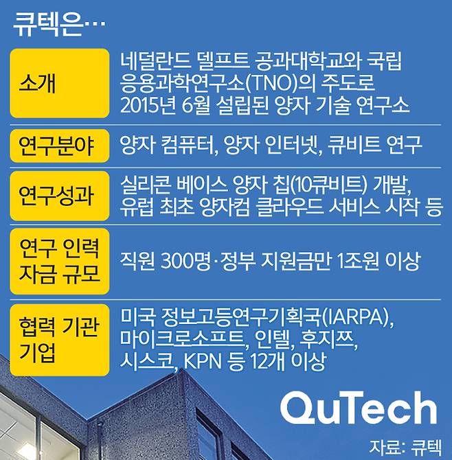 큐텍은 네덜란드 델프트 공과대학교와 국립 응용과학연구소(TNO)가 양자 기술 연구를 위해 2015년 공동으로 설립했다. 델프트 공대는 세계 공대 순위에서 10위권에 꼽히는 현지 최고 명문이다. TNO는 델프트 공대와 같은 네덜란드 유수 대학의 기초 연구를 응용해 원천기술을 상용화에 가깝게 만드는 국립 연구소다.